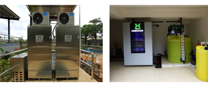 由于该项目运行已有7年,本次改造不宜再增加更多土建成本,我司根据现场情况制定方案,将格栅池下空间通道合理利用起来,仅新建两面砖墙,改造为加氯间。使用电解盐水现场制氯与投氯系统,同紫外消毒系统组合消毒,无需再建消毒池。极大地降低了改造成本。